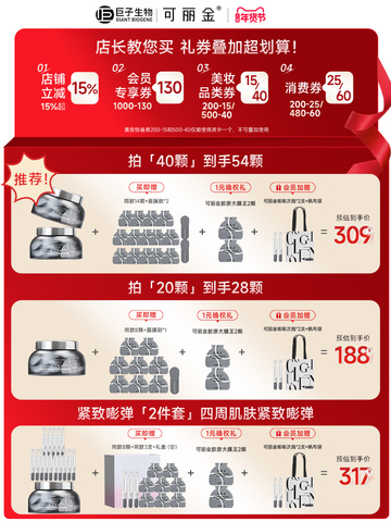 可丽金大膜王紧致抗皱驻颜面膜 【售价】:¥302.00 【券后】:¥297.00 【优惠券】:¥5 推荐理由:【拍2罐装,赠同款14颗+面膜刷*2,1元锁定赠2颗+会员加赠2颗+帆布袋,88vip叠消费券+荟圆劵+美妆券+陶琻币+直降,共56颗仅185.5,折3.3/颗】改善肌肤老化,抗皱成分补充胶原! 👉复制这条信息79¥ HU591 R17GUdXmvz1¥ 打开【手机淘宝APP】即可领券购买:/