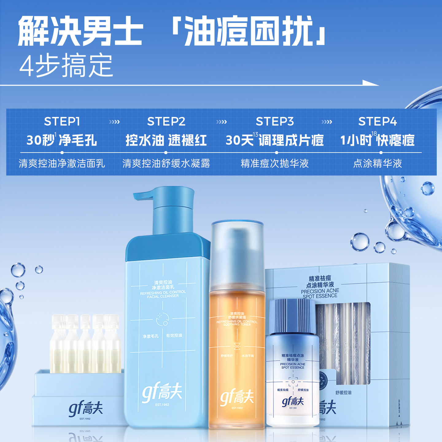 【赠祛痘次抛*20支+控油洗面奶30ml*3】gf高夫男士控油祛痘套装男士护肤品保湿清爽洁面次抛。