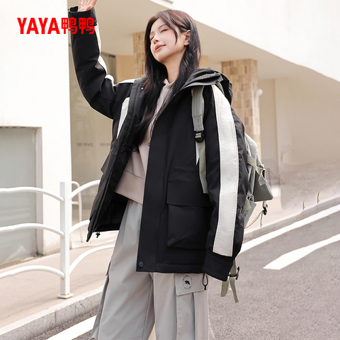 鸭鸭羽绒服女士2025冬季新品中长款连帽拼色休闲韩版保暖鸭绒外套!!
