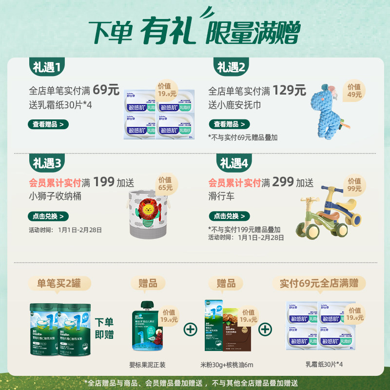 买3罐送弯曲叉勺+婴标果泥(正装)+米粉30g+乳霜纸30片*4,东北绿色大米低敏,强化二价铁易吸收,微米级细腻,纯粹植物蛋白配方,不多余添加,呵护宝宝娇嫩肠胃,全链用心!【赠运费险】