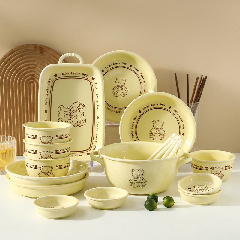ins奶油风幸运熊可爱餐具,色釉工艺,入口安全,可与食物直接接触,安全放心,加厚陶终隔热防烫,加厚材质易端拿,不烫手,可进微波炉烤箱等加热,原创印花设计,坚固耐用不褪色