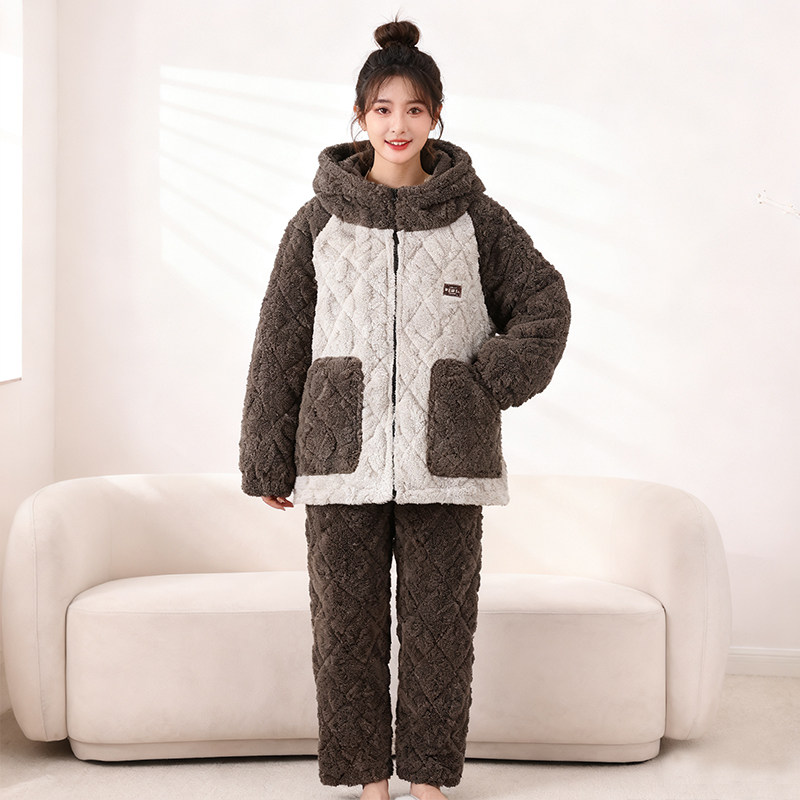 【秋冬保暖必备!】女士舒棉绒连帽拉链睡衣套装,三层加厚设计,柔软保暖,宽松舒适,居家穿着超惬意!拍2件仅需59.9元,性价比超高,速抢!