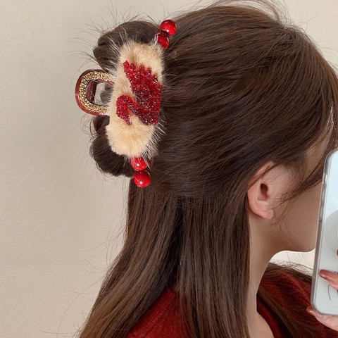 百超仙红色毛绒抓夹女新年喜庆氛围感发抓后脑勺盘发鲨鱼夹子头饰