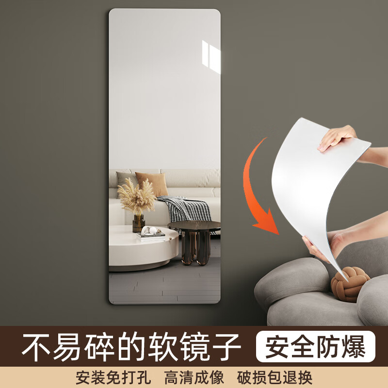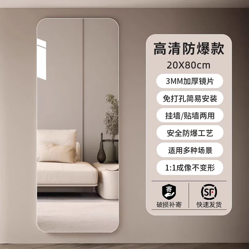 亚克力软镜子贴墙自粘家用全身镜穿衣镜贴柜门宿舍墙上镜子免打孔 圆角20*60免打孔高防爆