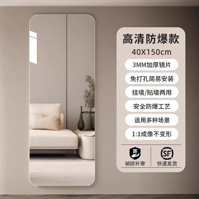 薇雅名依全身镜贴墙镜挂墙镜自粘镜子粘墙上镜子衣柜卧室免打孔粘贴试衣镜 40*150【高清防爆款】