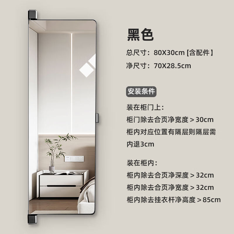 接运猫玄关高清穿衣镜全身镜可旋转折叠玻璃镜子家用衣柜镜卧室墙上镜子 黑色-总尺寸8030cm加厚防爆