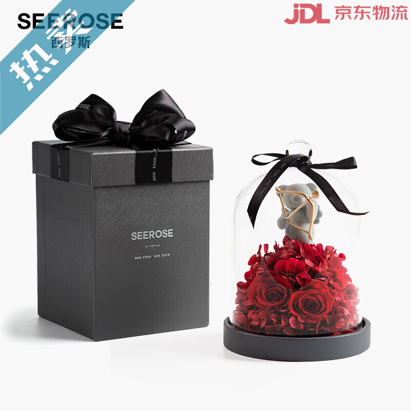 西罗斯(SEEROSE)永生花丘比特熊保鲜玫瑰花束高级春节情人节生日礼物送女朋友老婆 丘比特熊-嫣红 全国7仓发-不支持代写贺卡