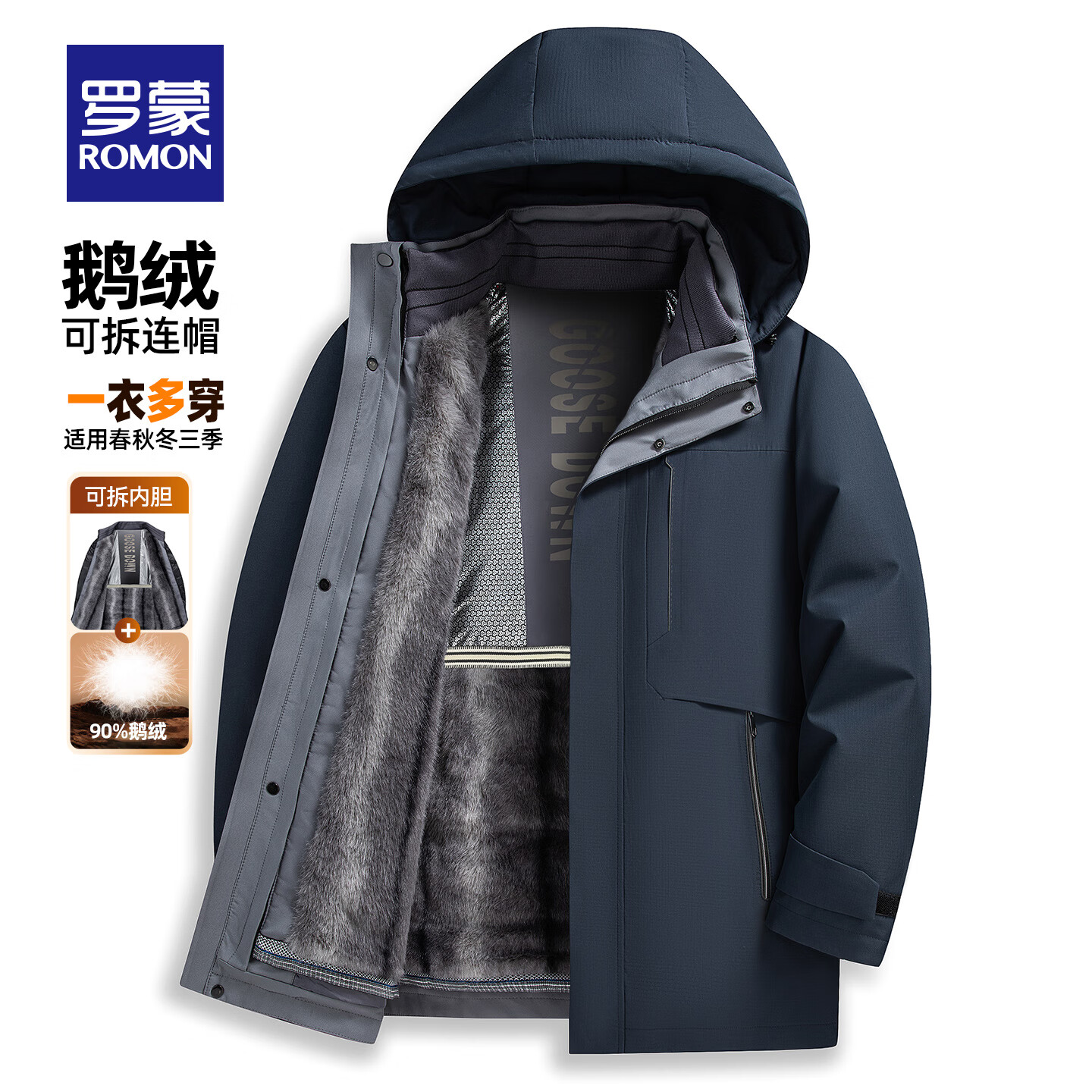 罗蒙(ROMON)一衣多穿可拆卸内胆连帽鹅绒羽绒服男士中长款保暖加厚防寒服外套 蓝灰色 XL 180(适合135-155斤)