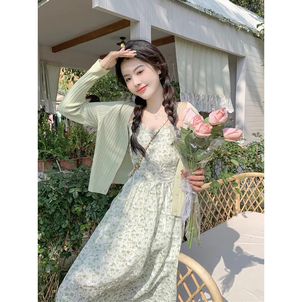 妍莉芬(yanlifen)茶歇法式碎花吊带裙子女秋季2025新款仙气森系甜美连衣裙两件套夏 523绿色开衫+绿色吊带裙 M