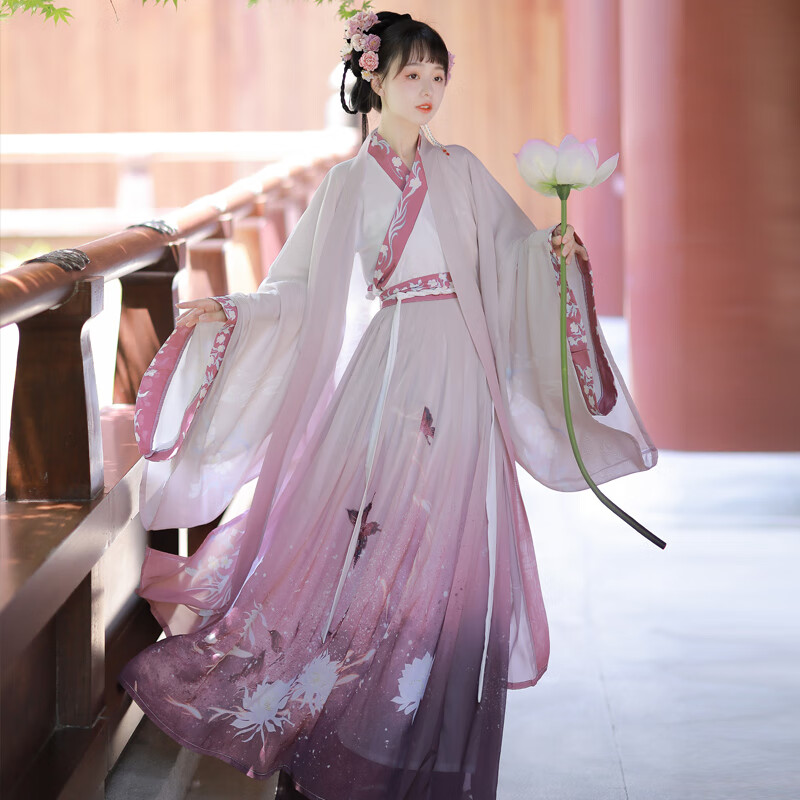 卡辑汉服女中国风仙气晋制刺绣交领齐腰襦裙古风成人学生 渐变粉 (大袖衫+上衣+下裙) M