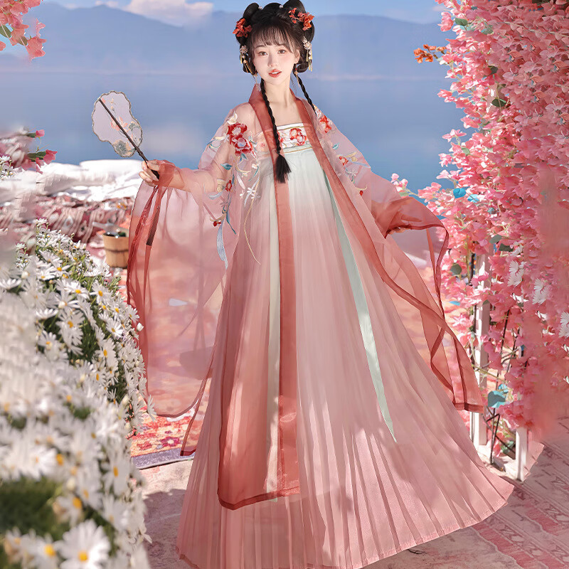 督型暮挽璃原创唐制汉服成人女裙仙气飘逸夏款中国风古装全套春 花间领红色 2XL