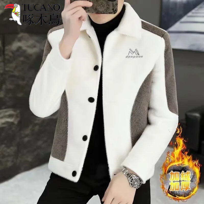 啄木鸟(TUCANO)冬季男士水貂绒毛呢外套翻领加绒加厚潮流短款风衣男装青年仿皮草 PRO-150-白色 2XL 建议135斤-150斤