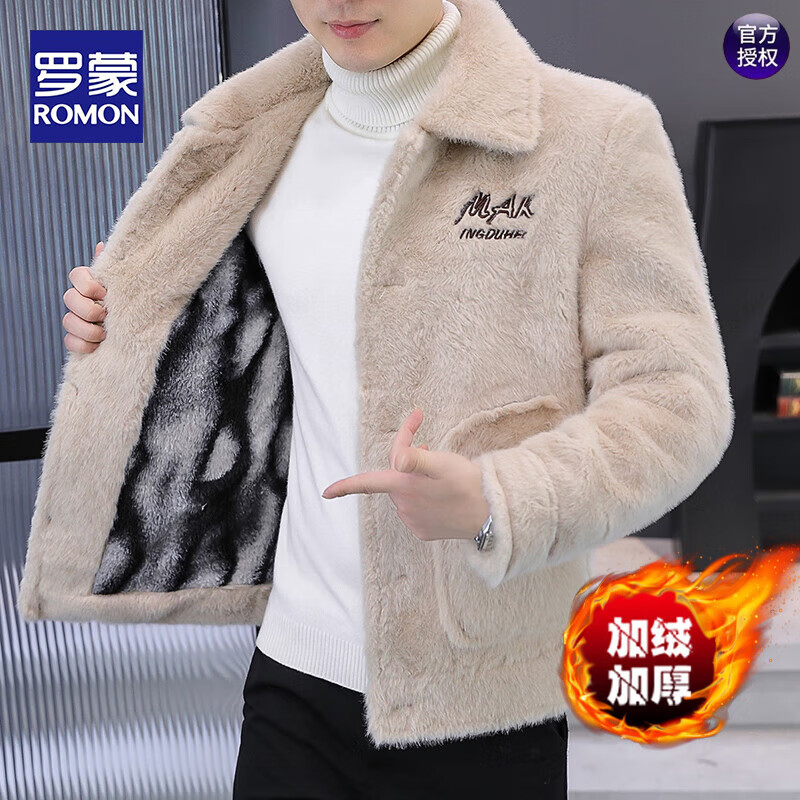 罗蒙(ROMON)秋冬季水貂绒夹克男加绒加厚休闲仿皮草外套痞帅韩版潮流短款棉衣 米色 3XL 建议155-170斤