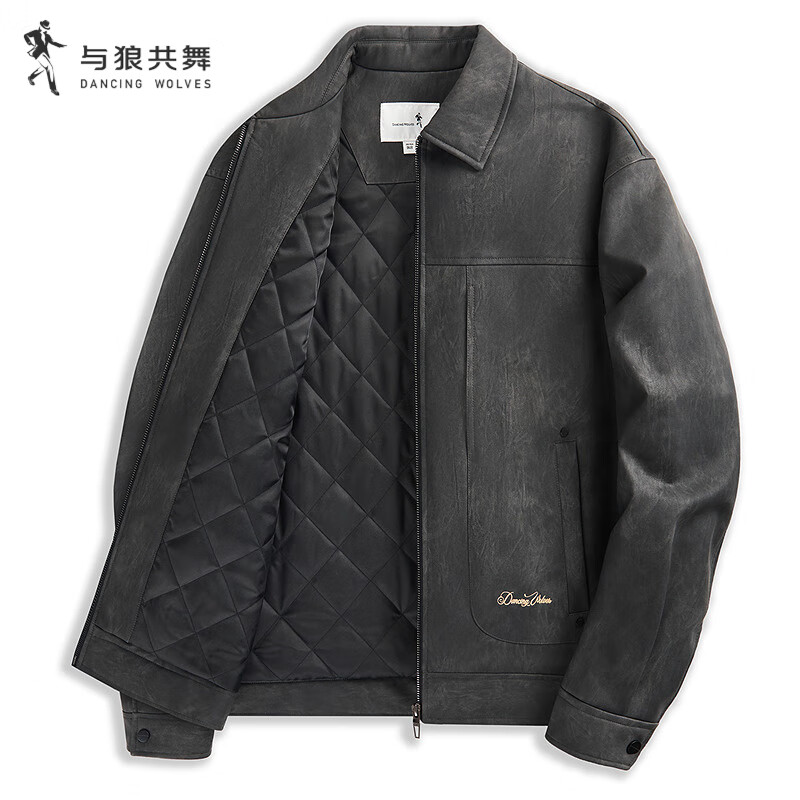 与狼共舞【夹棉加厚】质感纹理环保仿皮PU糯感晕染翻领夹克男 001黑色 L