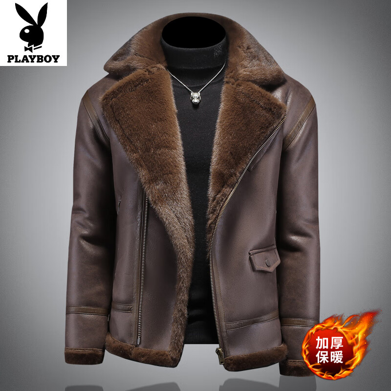 花花公子(PLAYBOY)高端皮毛一体外套男机车翻领痞帅加厚防寒保暖皮衣冬季仿皮草上衣 深咖色 L