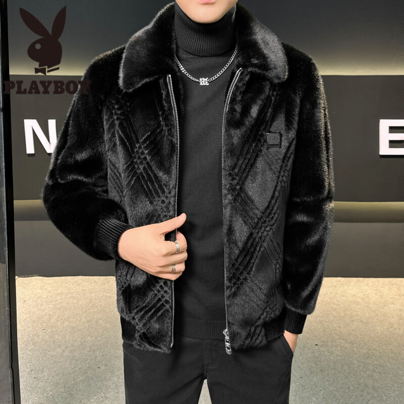 花花公子男士水貂毛仿皮草外套加厚保暖翻领大衣 黑色【金貂绒】 加厚 M 100-115斤