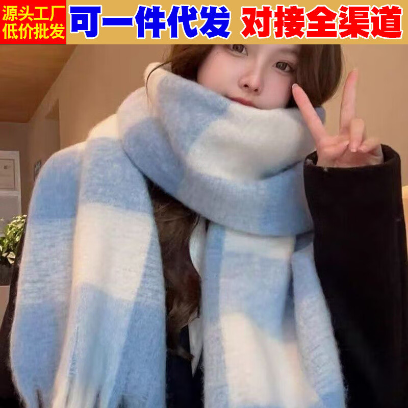 SKONWAT冬季新款美拉德仿羊绒围巾洋气格子披肩两用冬季保暖百搭韩版围脖 蓝白格子 210*30