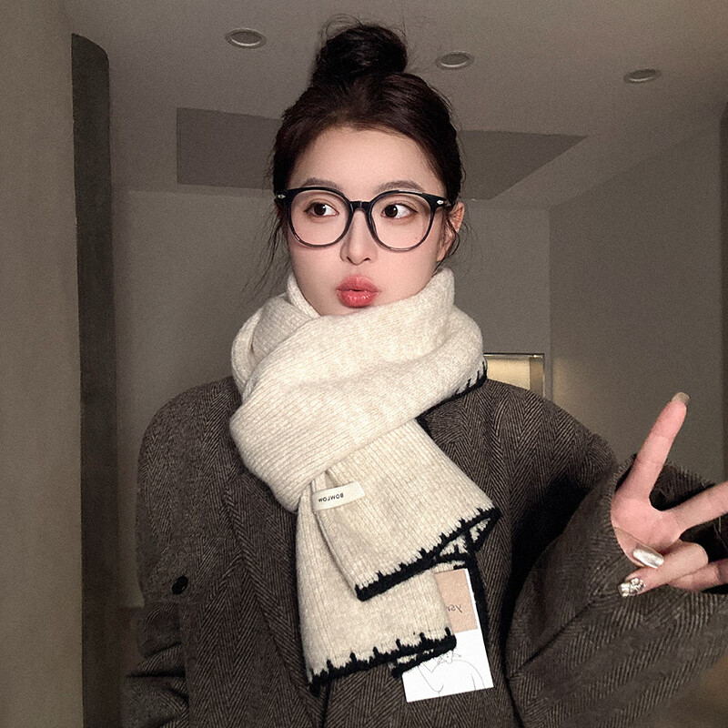 目丸高级感韩版百搭围巾女秋冬季软糯针织仿羊绒护颈围脖2025新款潮 米色