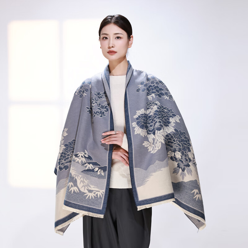 达芬奇密码秋冬保暖仿羊绒披肩女外搭气质民族风云南旅游斗篷外套空调房毯子 玉蕊山河 雾蓝(双面)