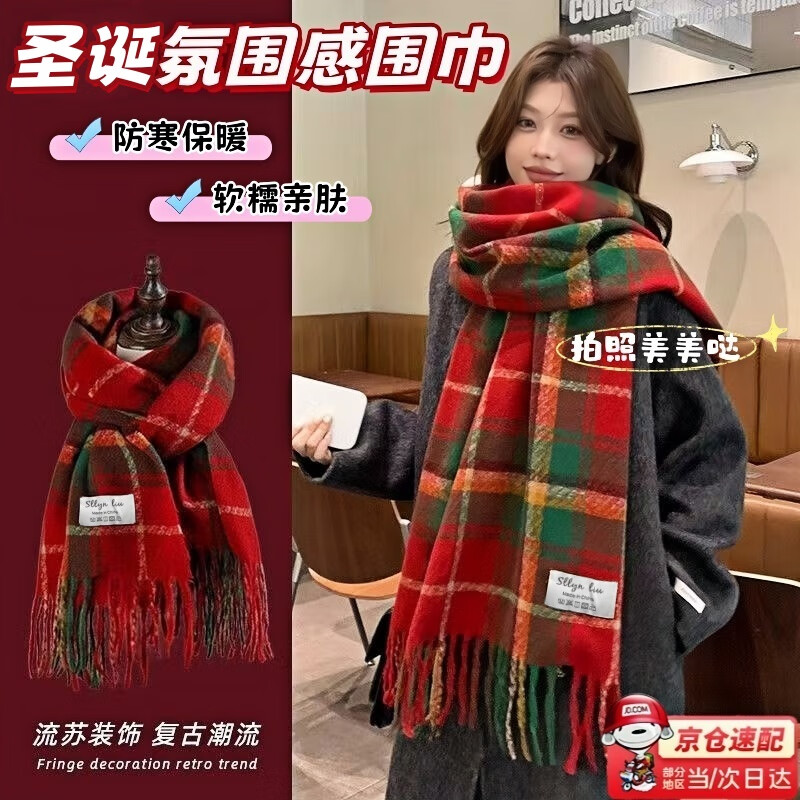 泉碧焱新年红色围巾学生圣诞礼物披肩学院风氛围感格纹围脖韩版仿羊绒 【约60*200cm】圣诞红绿格