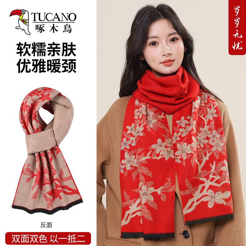 啄木鸟围巾女士秋冬季双面仿羊绒保暖围脖披肩妈妈长辈送生日礼物中国红