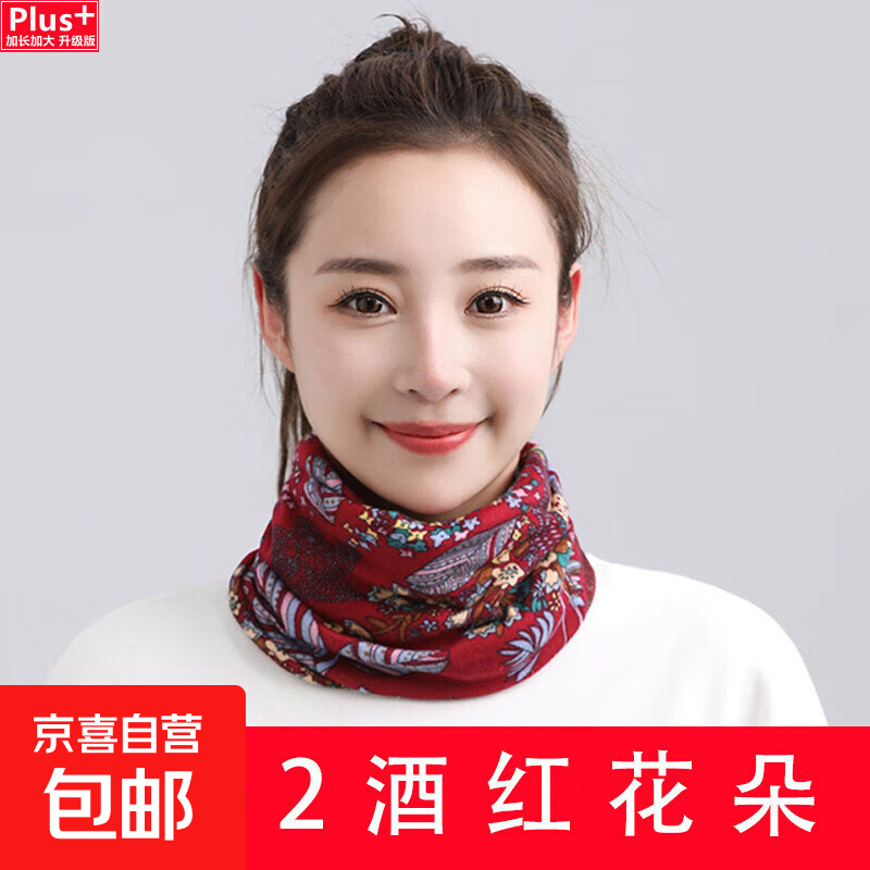 防寒保暖百变围脖套头秋冬堆堆帽仿羊绒脖套多功能针织男女扭扭帽 酒红花朵 大版型