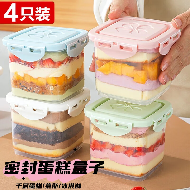 威尔基可循环蛋糕盒子食品罐包装盒慕斯蛋糕盒透明方形打包提拉米苏罐子 650ml蓝白绿粉丨四个装*不含蛋糕
