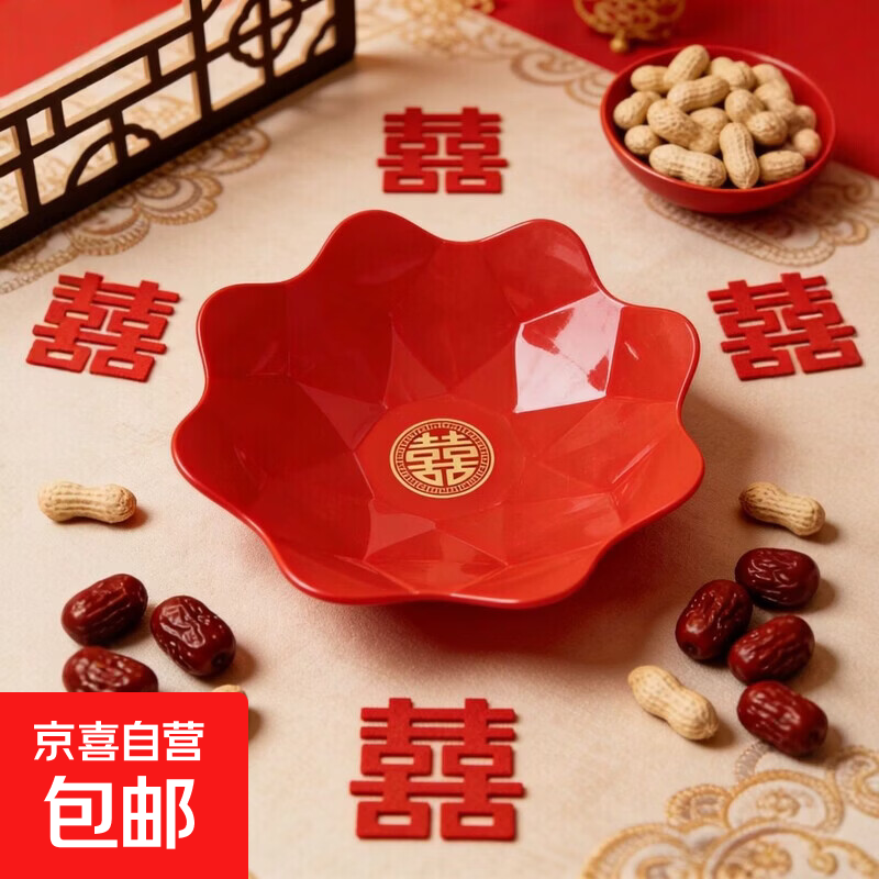 发饰收纳盘新年春节红色喜字收纳盒家用发绳发圈桌面收纳盘 波浪纹喜字果盘(直径19.6cm) 2个