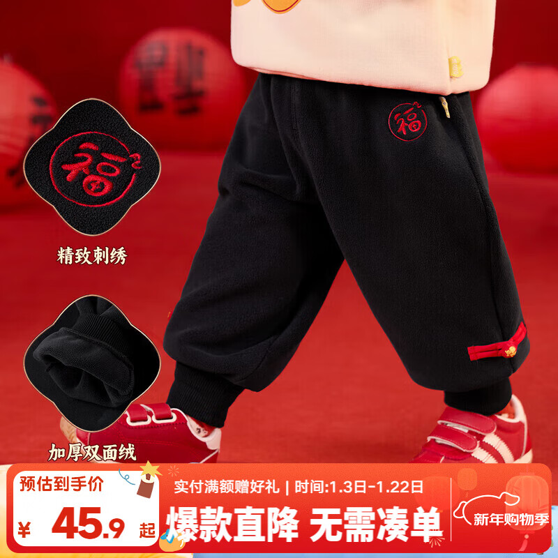 嘟嘟家【国风福字裤】儿童加绒加厚裤子冬季宝宝周岁礼服男童拜年服唐装 黑色 100