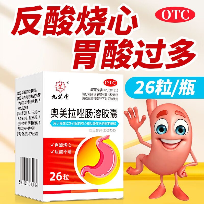 [九芝堂]奥美拉唑肠溶胶囊 20mg*26粒 1盒装 26粒胃胀气反酸烧心胃酸多肠胃炎消化用药胃痛疼药幽门螺旋杆菌四联药14天 一粒起效 强效抑酸