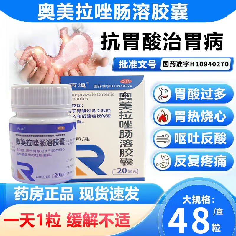 奥美拉唑肠溶胶囊 20mg*48粒/盒胃药胃疼胃胀胃炎胃肠炎四联疗法幽门螺旋杆菌四联药胃酸反酸烧心 1盒装