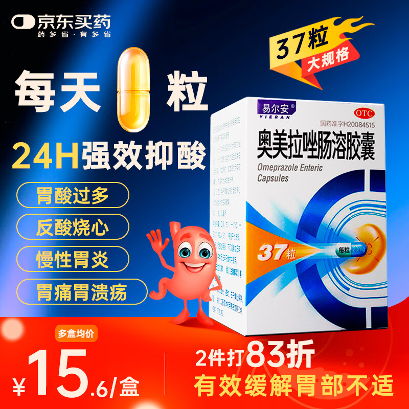 易尔安 奥美拉唑肠溶胶囊20mg*37粒奥美拉挫胶囊幽门螺旋杆菌四联药治疗胃反酸烧心抑制胃酸胃胀胃痛