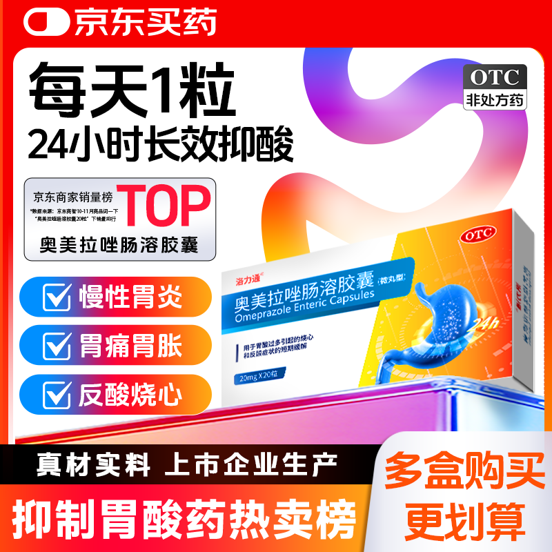 洛力通奥美拉唑肠溶胶囊20mg*20粒胃药胃疼胃胀胃炎胃肠炎四联疗法幽门螺旋杆菌四联药胃酸反酸烧心胃黏膜保护剂