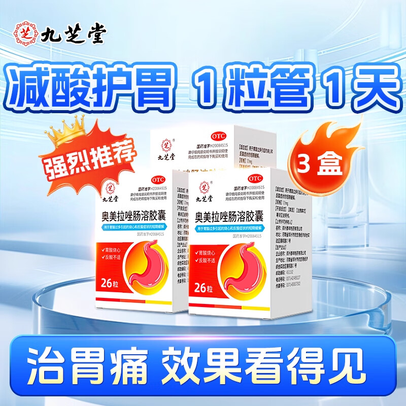 [九芝堂]奥美拉唑肠溶胶囊 20mg*26粒 3盒装 26粒胃胀气反酸烧心胃酸多肠胃炎消化用药胃痛疼药幽门螺旋杆菌四联药14天 实惠装-护胃常备