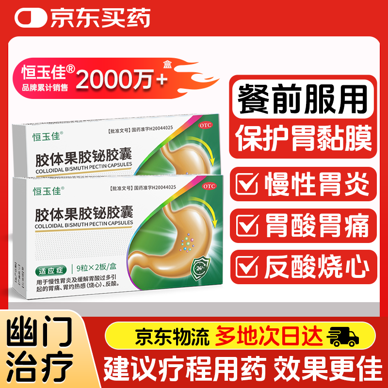 恒玉佳胶体果胶铋胶囊9粒*2板胃酸反酸烧心幽门螺旋杆菌四联药其一搭配奥美拉唑肠溶胶囊治疗胃炎胃黏膜保护剂