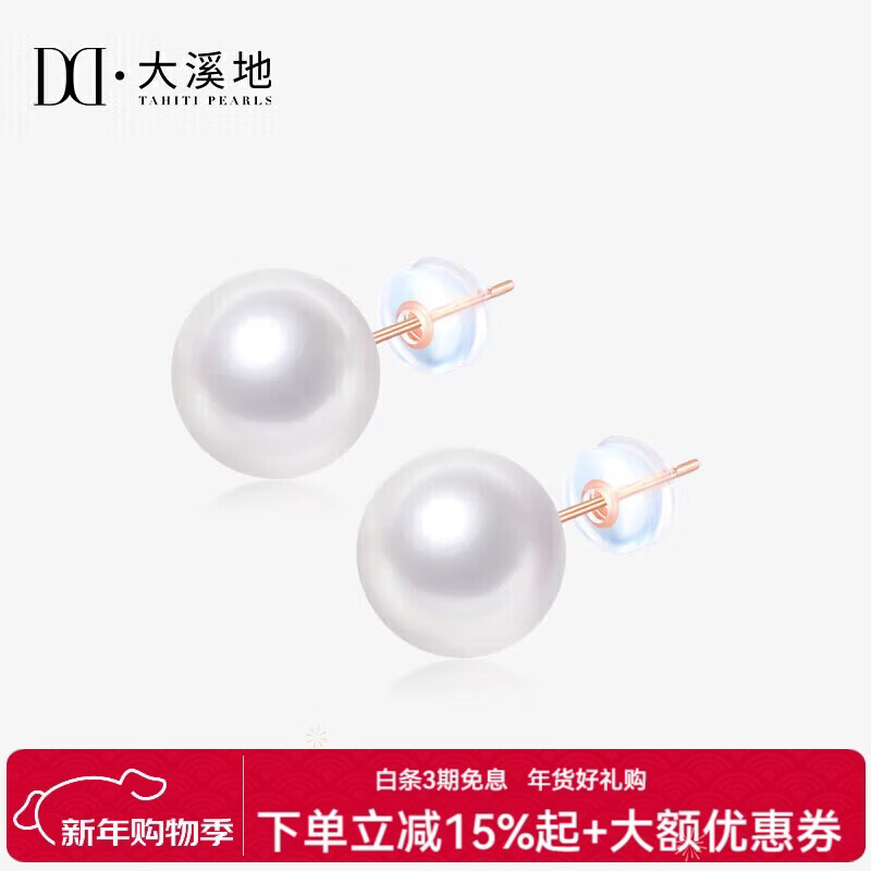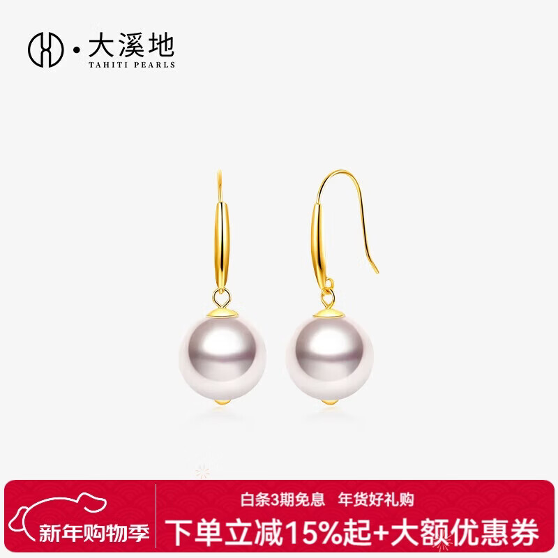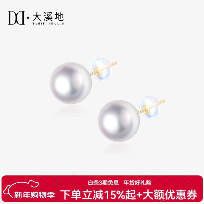 大溪地18K金淡水珍珠耳钉 9-10mm强光白色珍珠耳饰新年礼物送女生