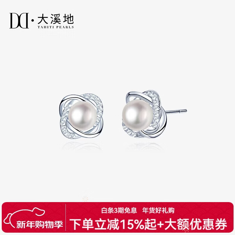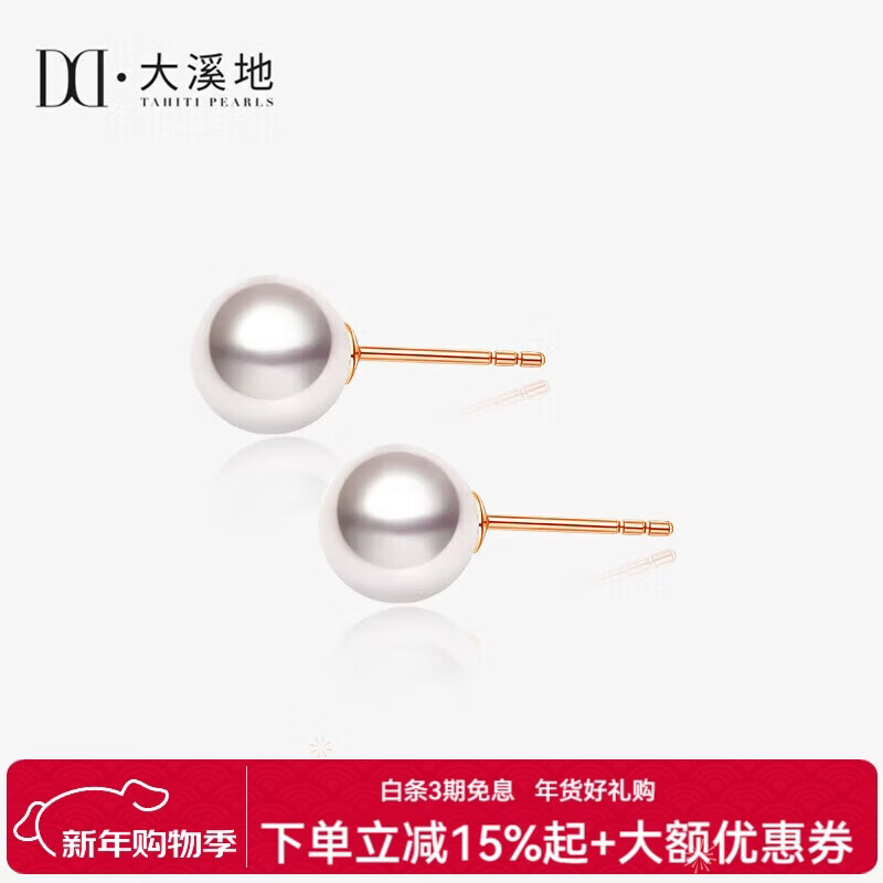 大溪地18K金淡水珍珠耳钉 7-8mm强光白色珍珠耳饰新年礼物送女生