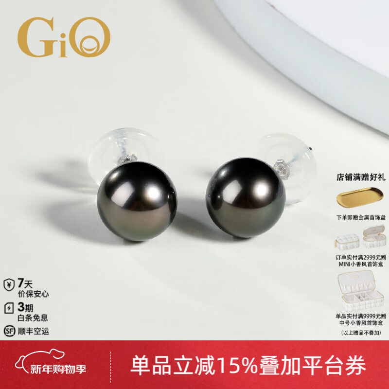 GiO珠宝 大溪地黑珍珠耳钉18K金耳饰GUILD孔雀绿新年礼物送女友 18K金 8-9mm微瑕