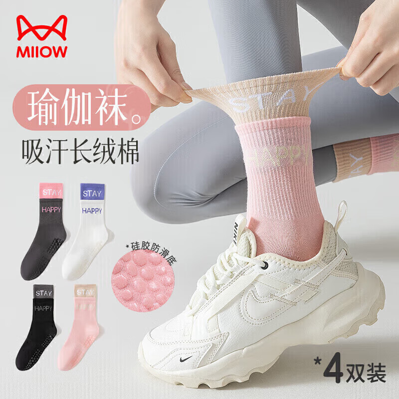 猫人4双女士袜子女双螺口中筒瑜伽袜潮流时尚硅胶防滑健身运动袜