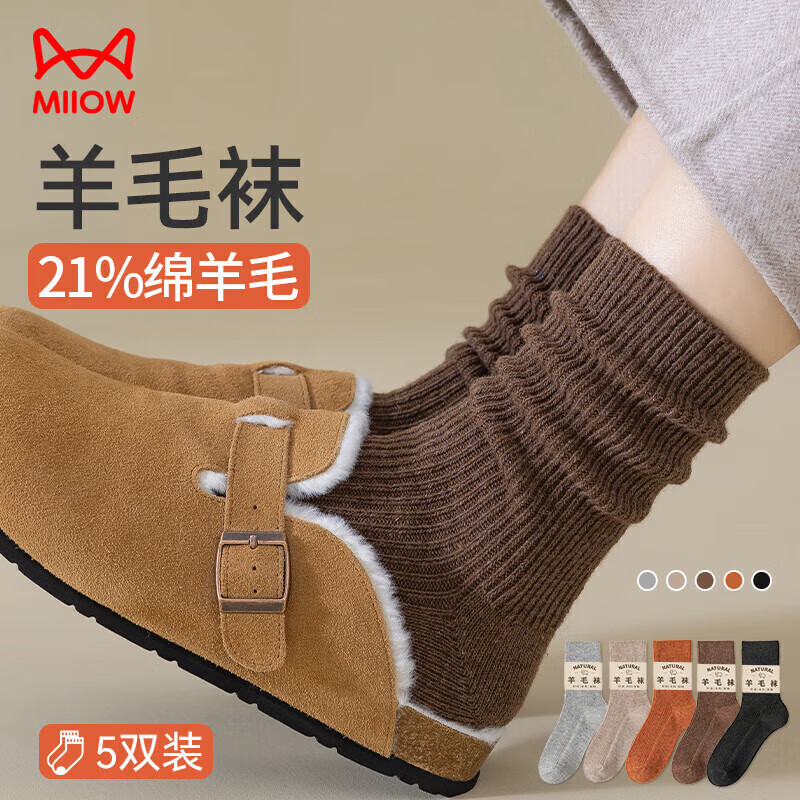 猫人5双装21%羊毛袜子女双针羊毛中筒袜秋冬女士防寒保暖长袜