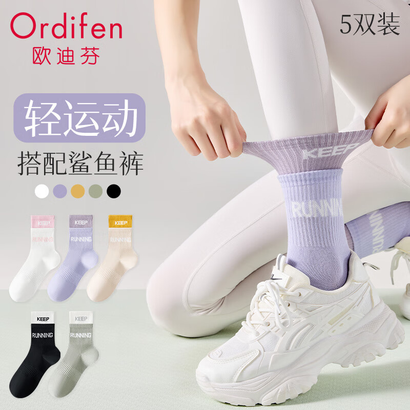 欧迪芬5双女士袜子女10A抑菌防臭中筒袜女双罗口搭配鲨鱼裤轻运动棉袜