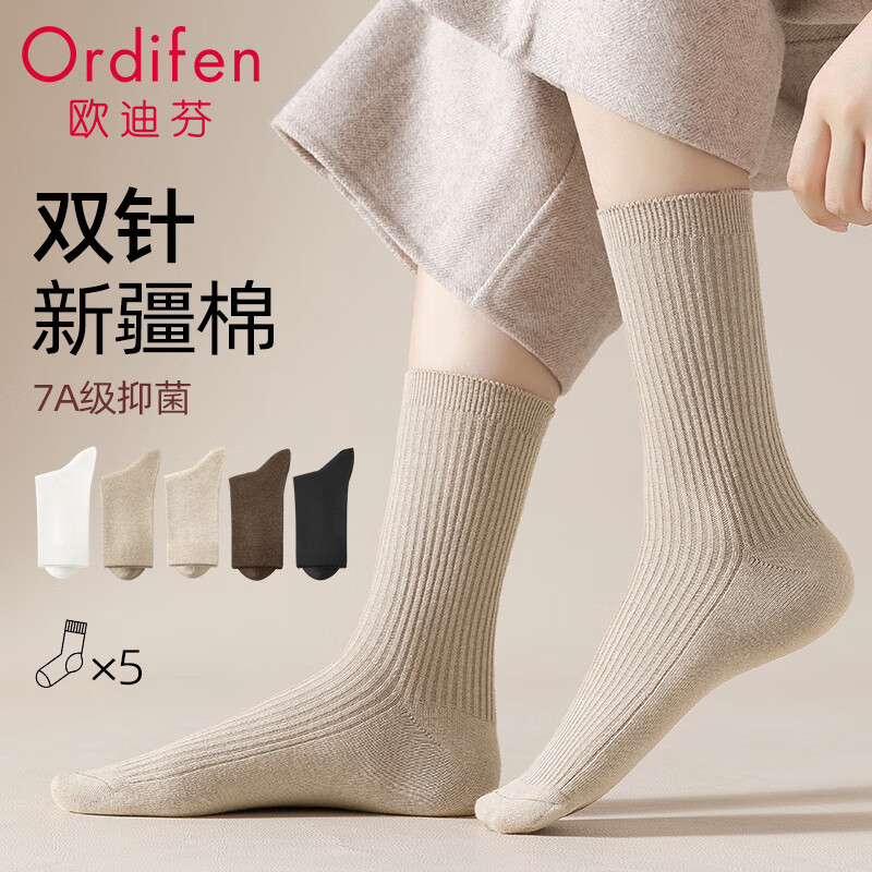 欧迪芬5双袜子女双针抗起球7A抑菌防臭新疆棉袜条纹长筒袜女士中筒袜女