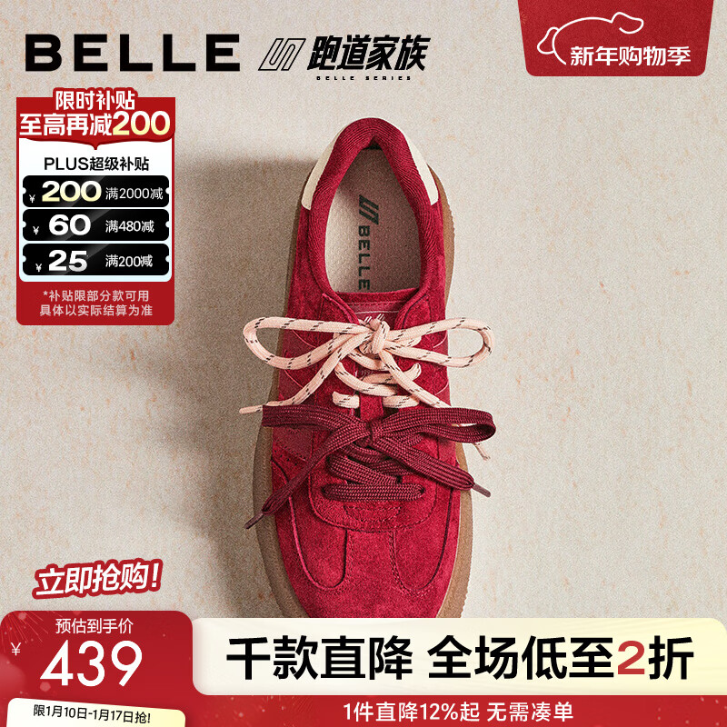 百丽(Belle)张凌赫同款绒面跑道德训鞋女双鞋带休闲鞋B2897CM5预售 红色 36