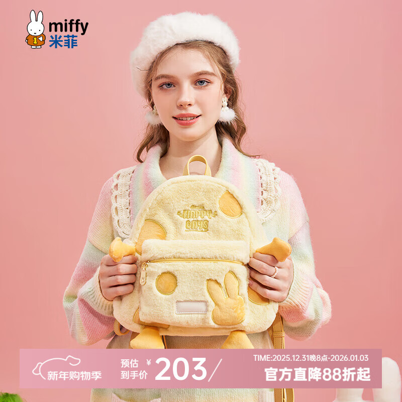 米菲(MIFFY)背包女双肩包大学生初中高中书包高颜值ins简约仿兔毛奇趣毛绒包 黄色