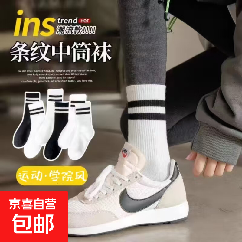 【条纹中筒袜】袜子女双杠黑白灰简约春秋冬学院风运动配鲨鱼裤 【1双】随机颜色(新人专享) 均码