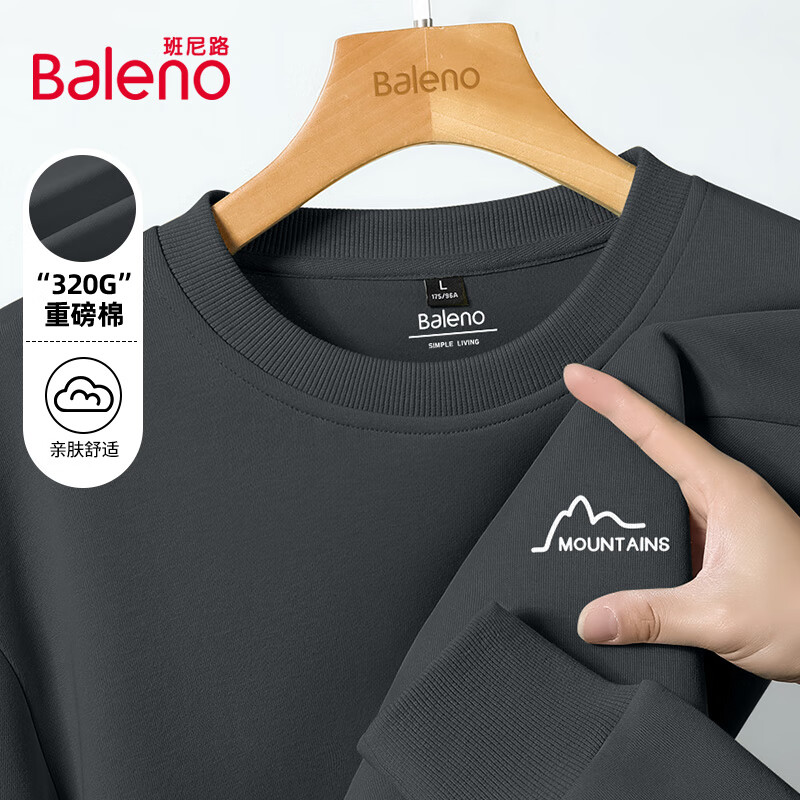 班尼路(Baleno)圆领卫衣男320G重磅简约百搭春秋季长袖上衣宽松大码情侣外套