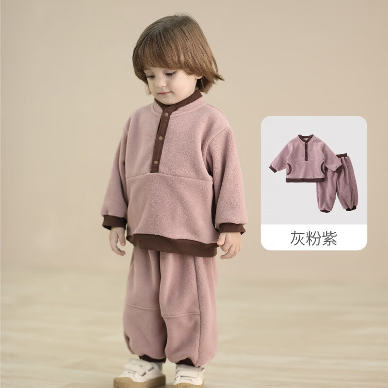 巴厘小猪儿童摇粒绒套装秋冬宝宝加厚保暖两件套男童外出分体衣服女童冬装 灰粉紫 90