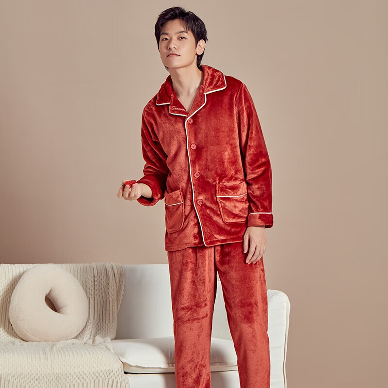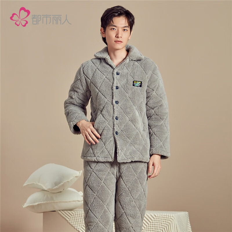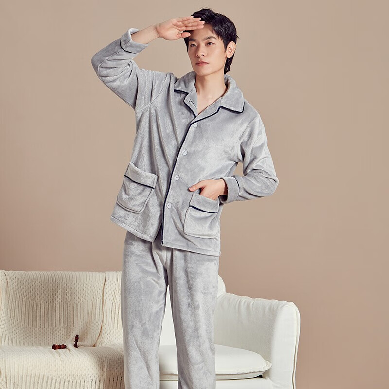 都市丽人内衣男士秋冬家居服套装加厚珊瑚绒简约开襟长袖法兰绒睡衣4H1103