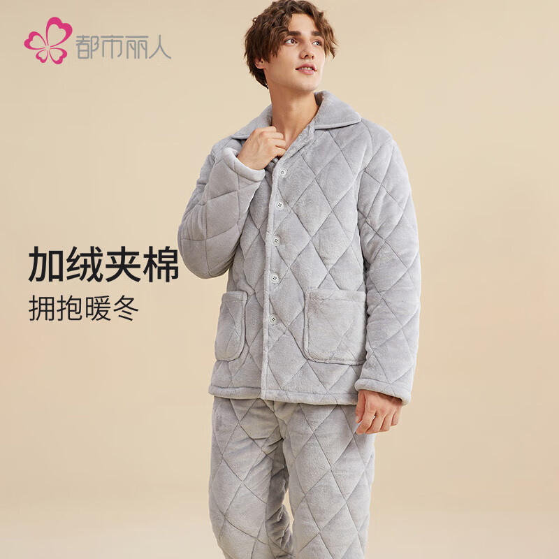 都市丽人家居服男女加厚夹棉法兰绒简约开襟长袖睡衣情侣套装4H3015