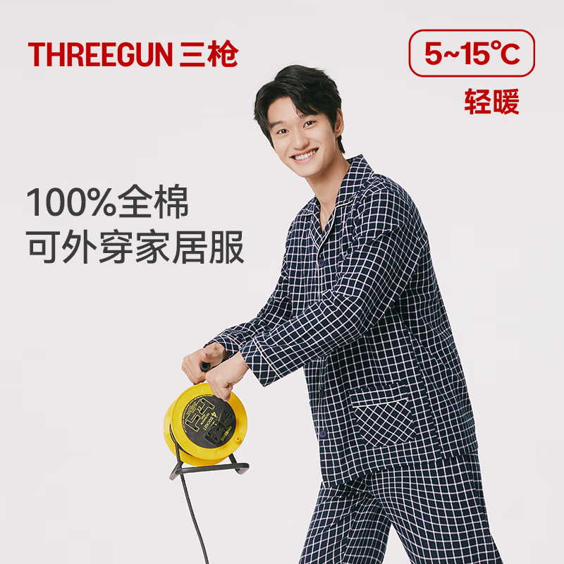 三枪【纯棉绒布】睡衣男翻领舒适开襟经典格纹情侣家居套装
